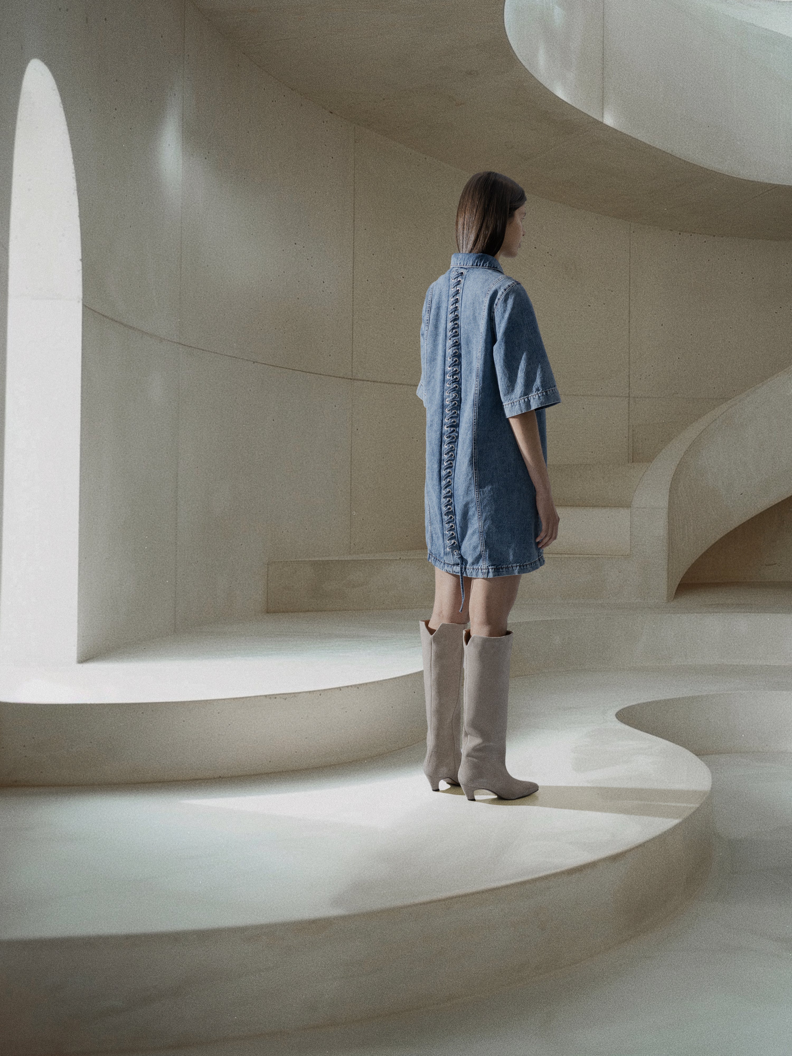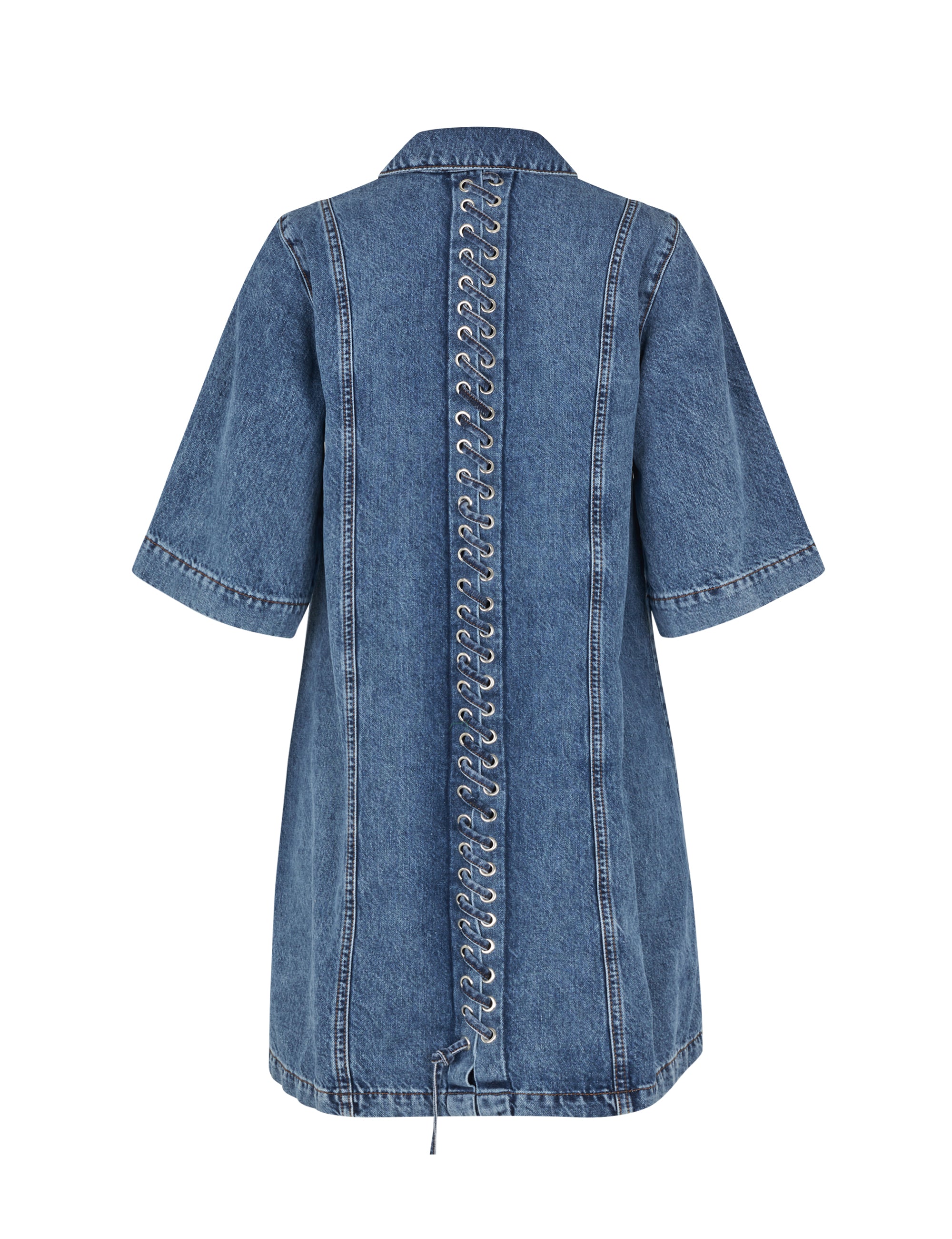 Denim jurk met knopen en veterdetails.