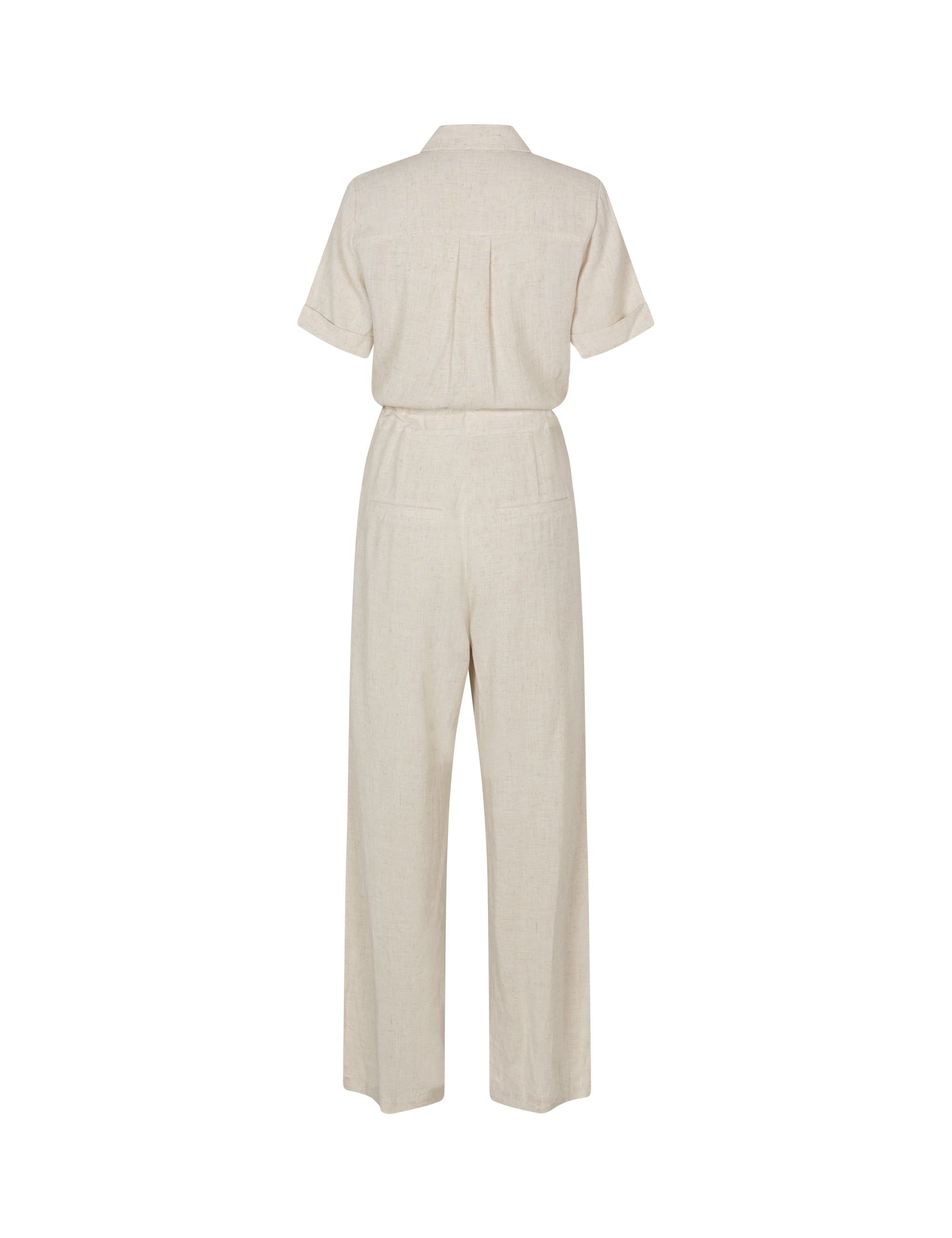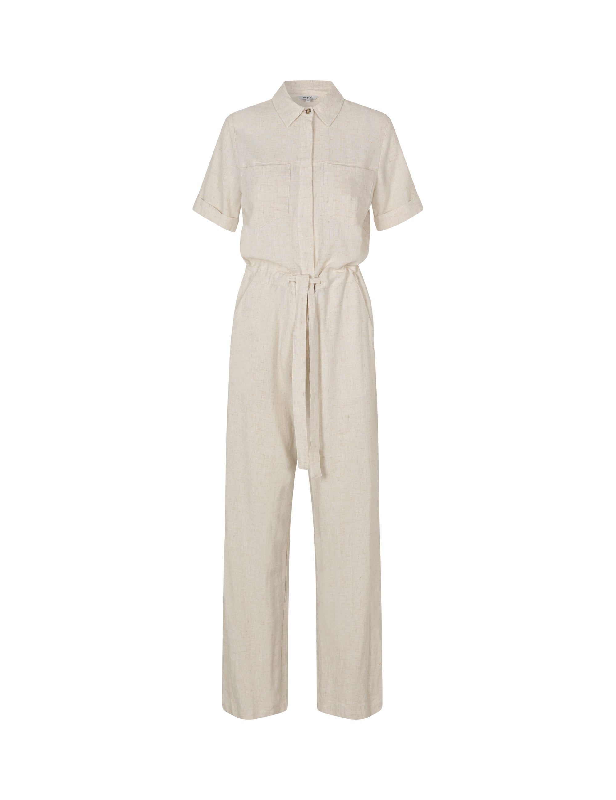 Kortmouwige jumpsuit met trekkoord in de taille.