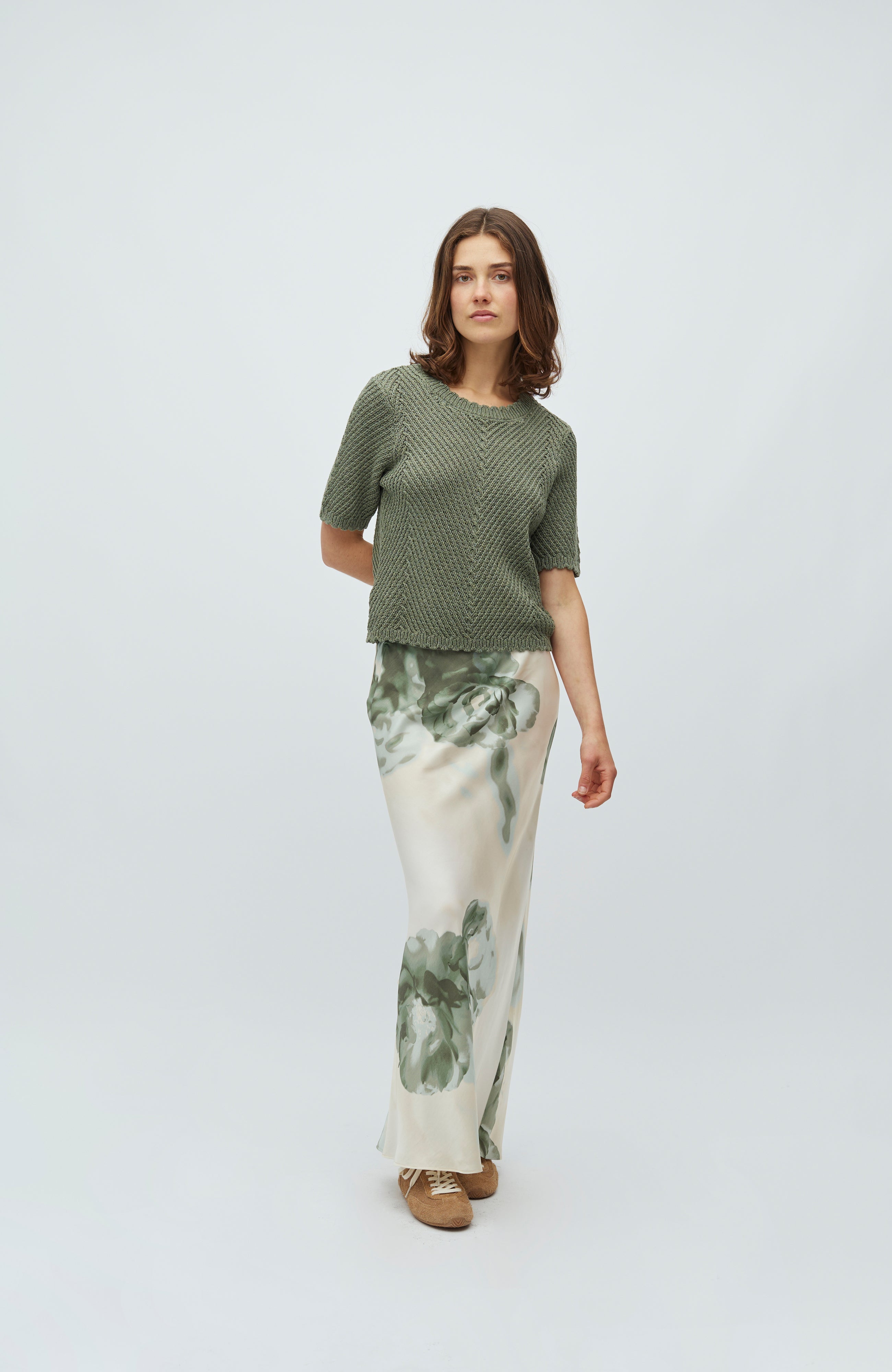 De lengte van het model is 179 cm en ze draagt maat S.