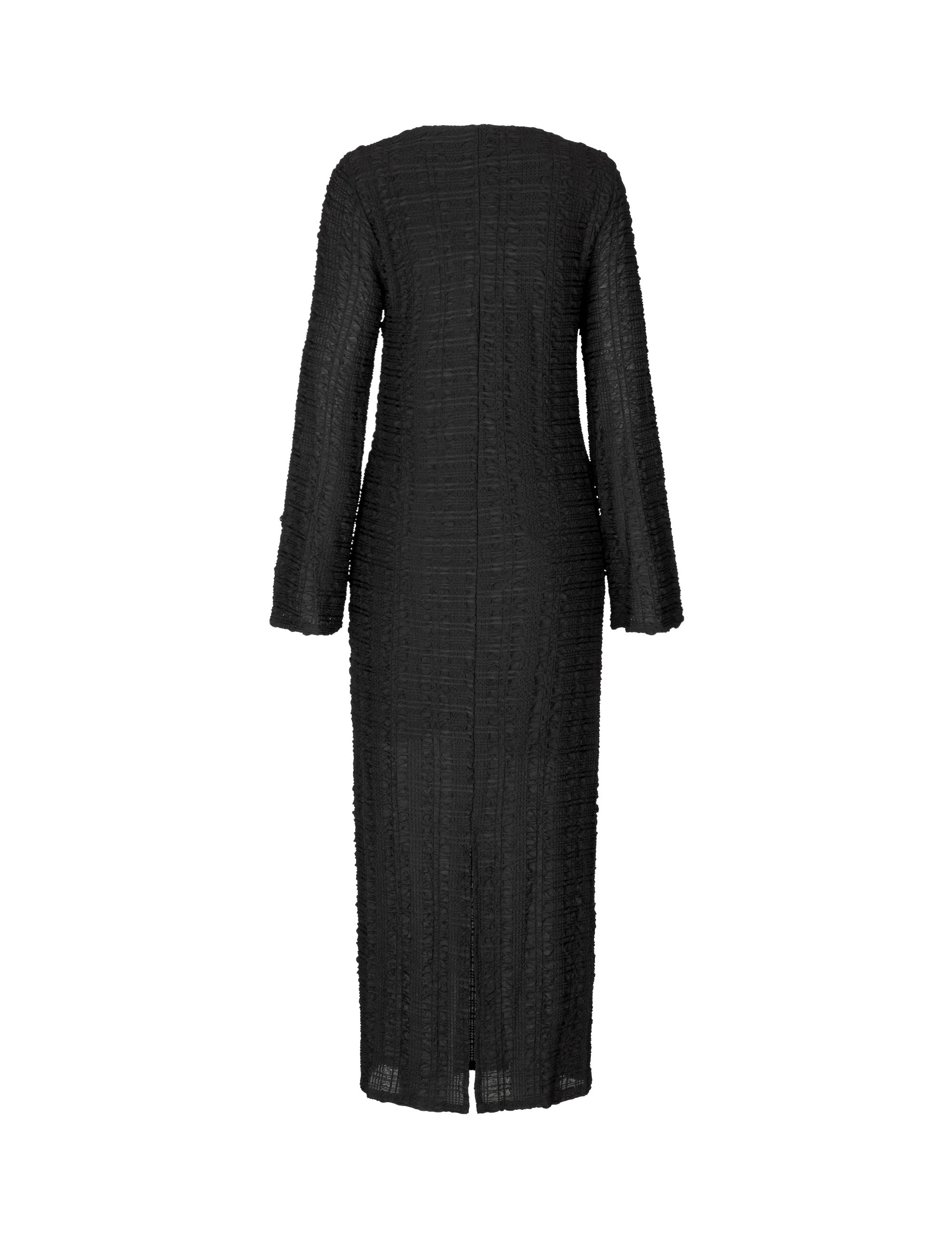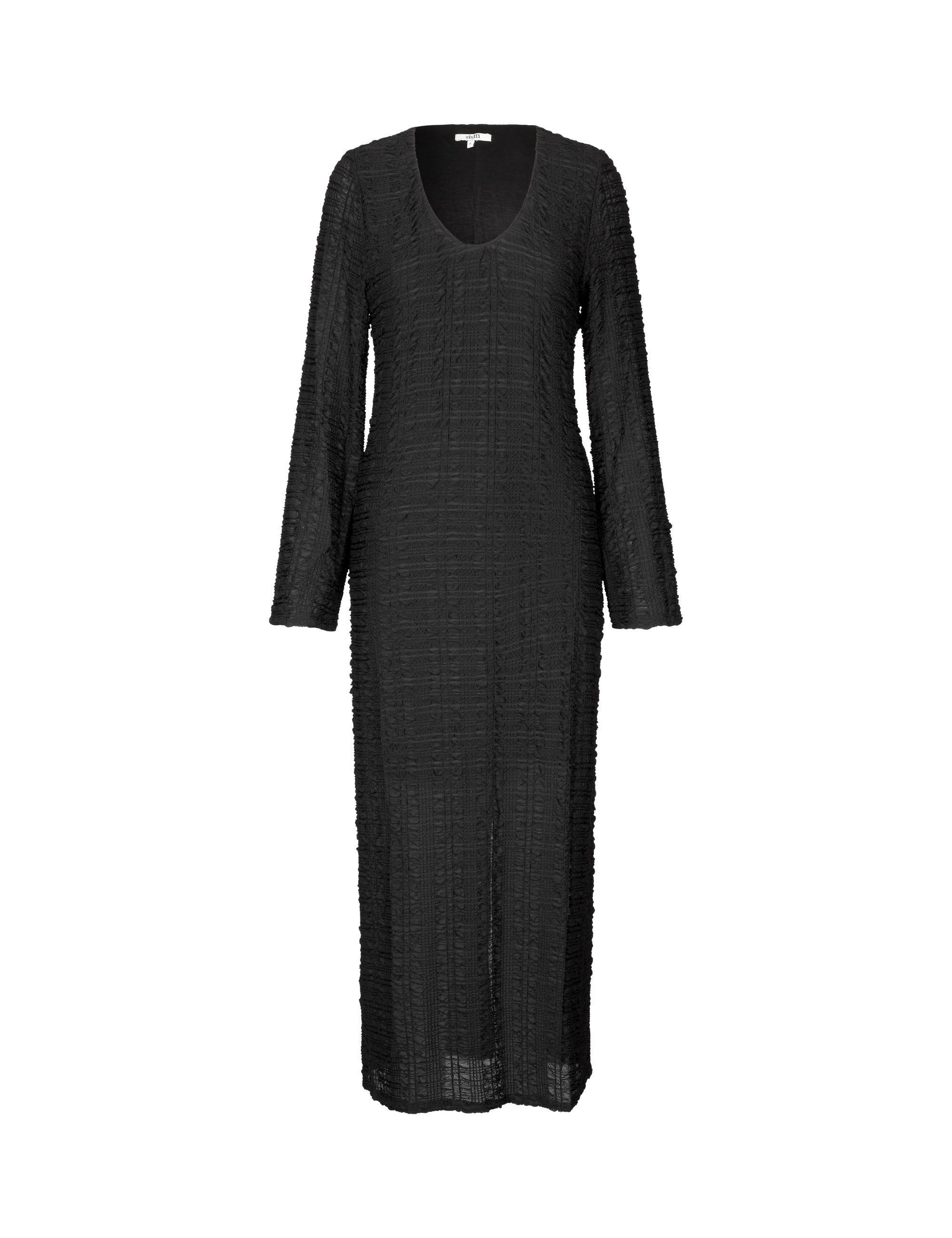 Lange jurk met een diepe ronde hals en lange mouwen.