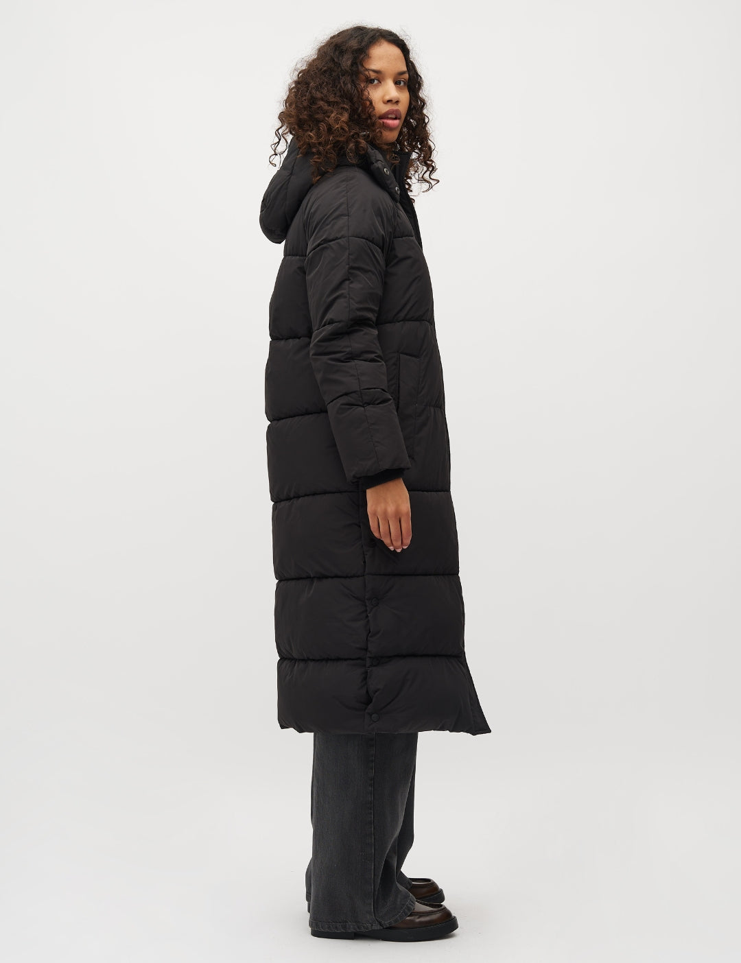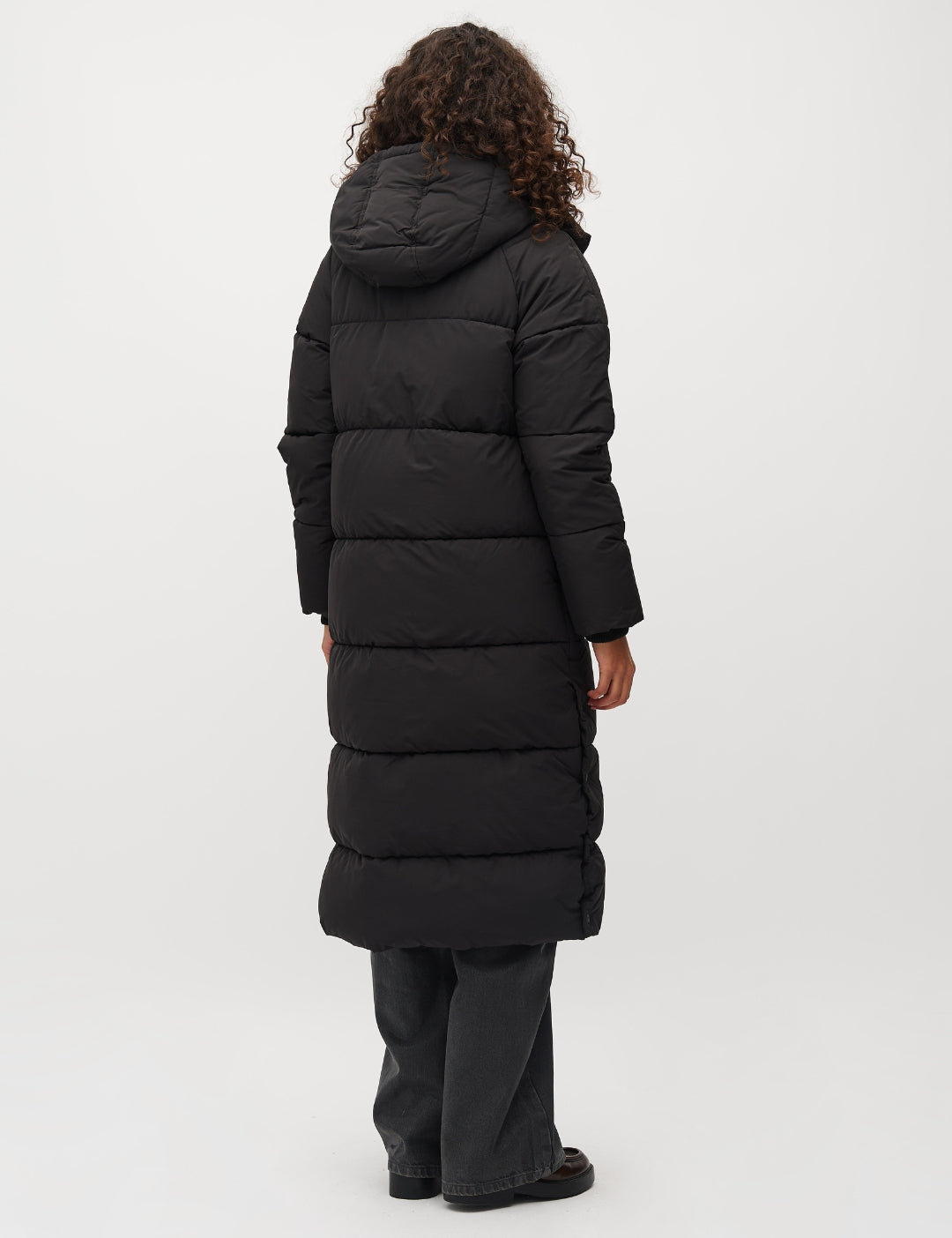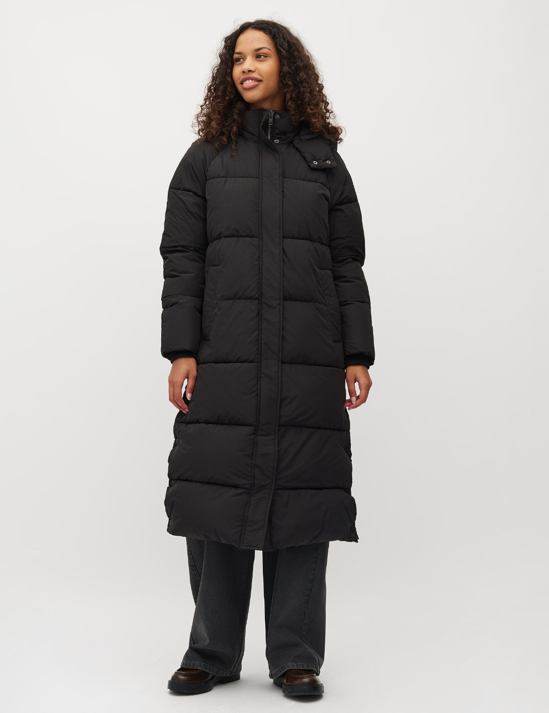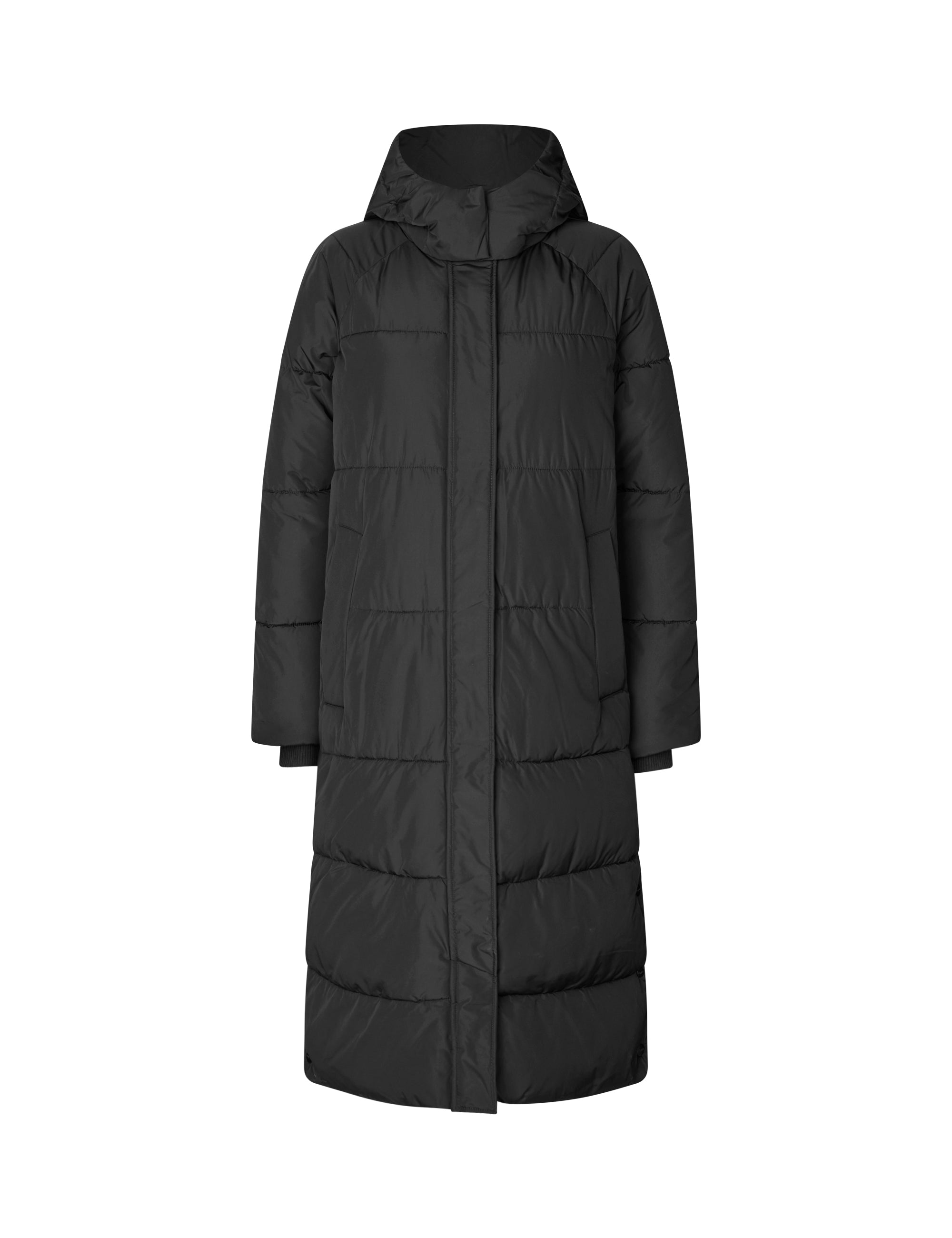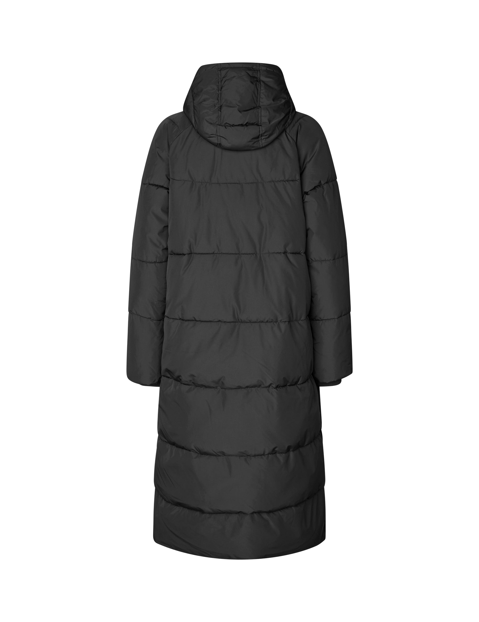 Lange gewatteerde jas met capuchon.