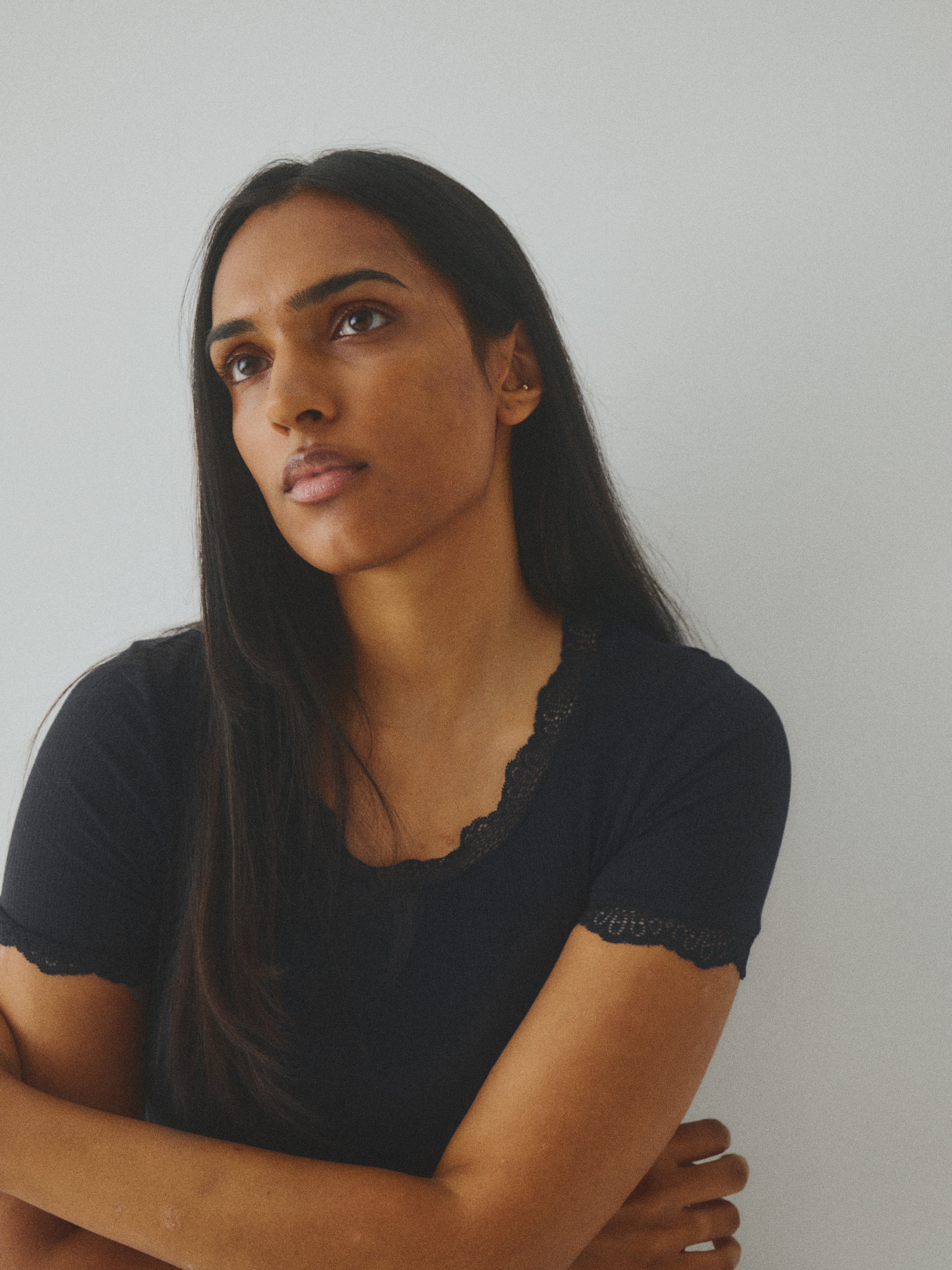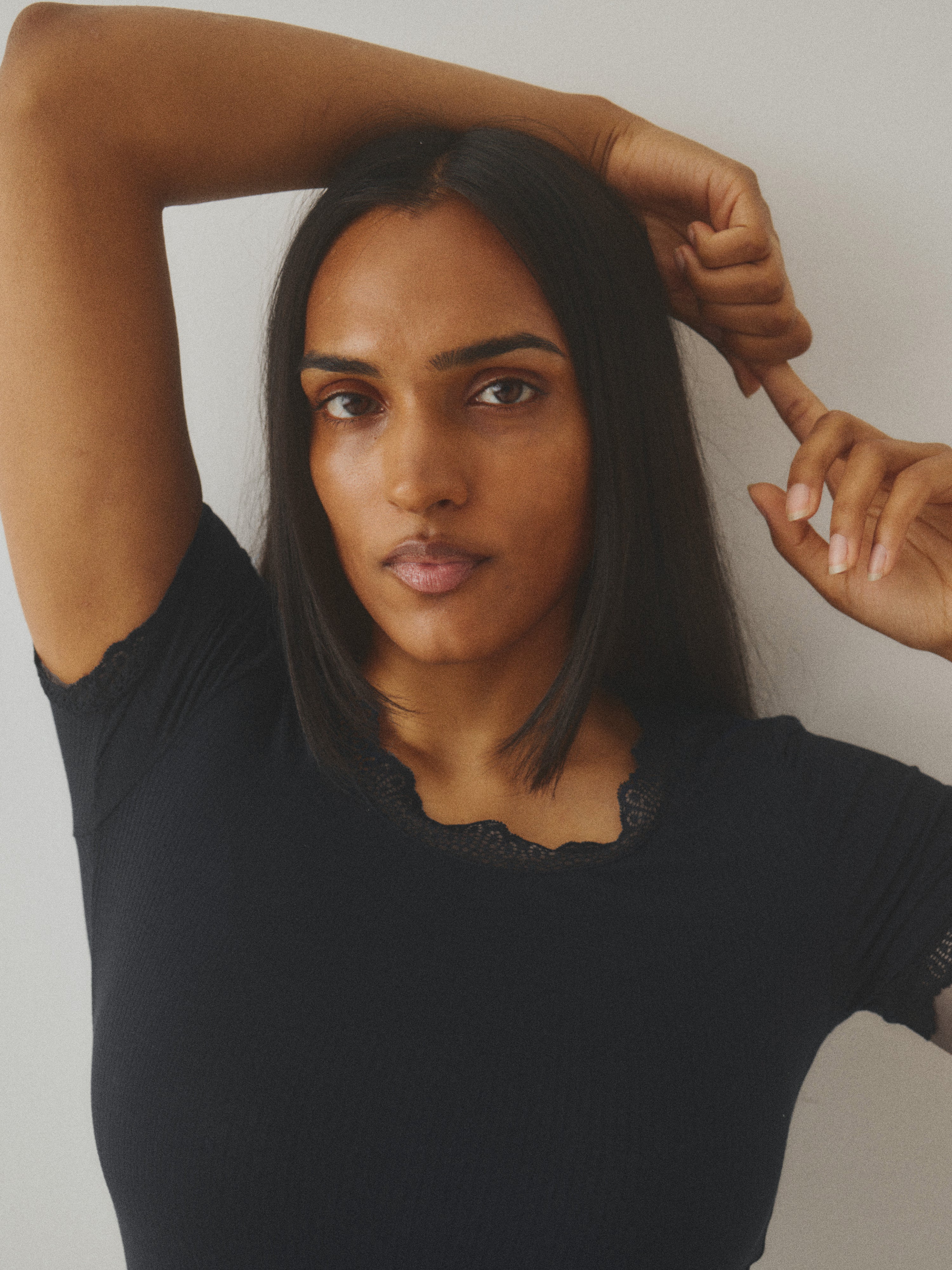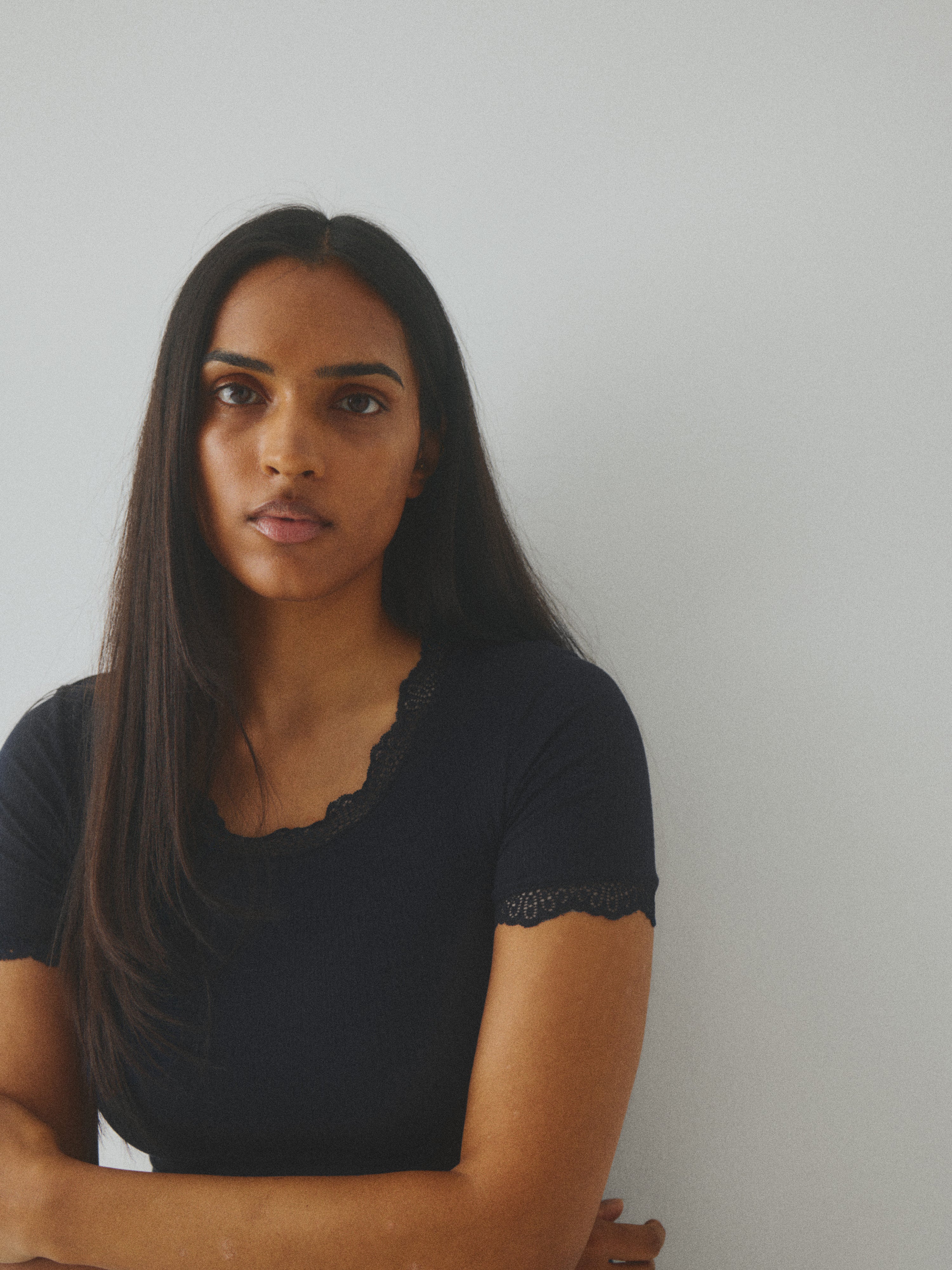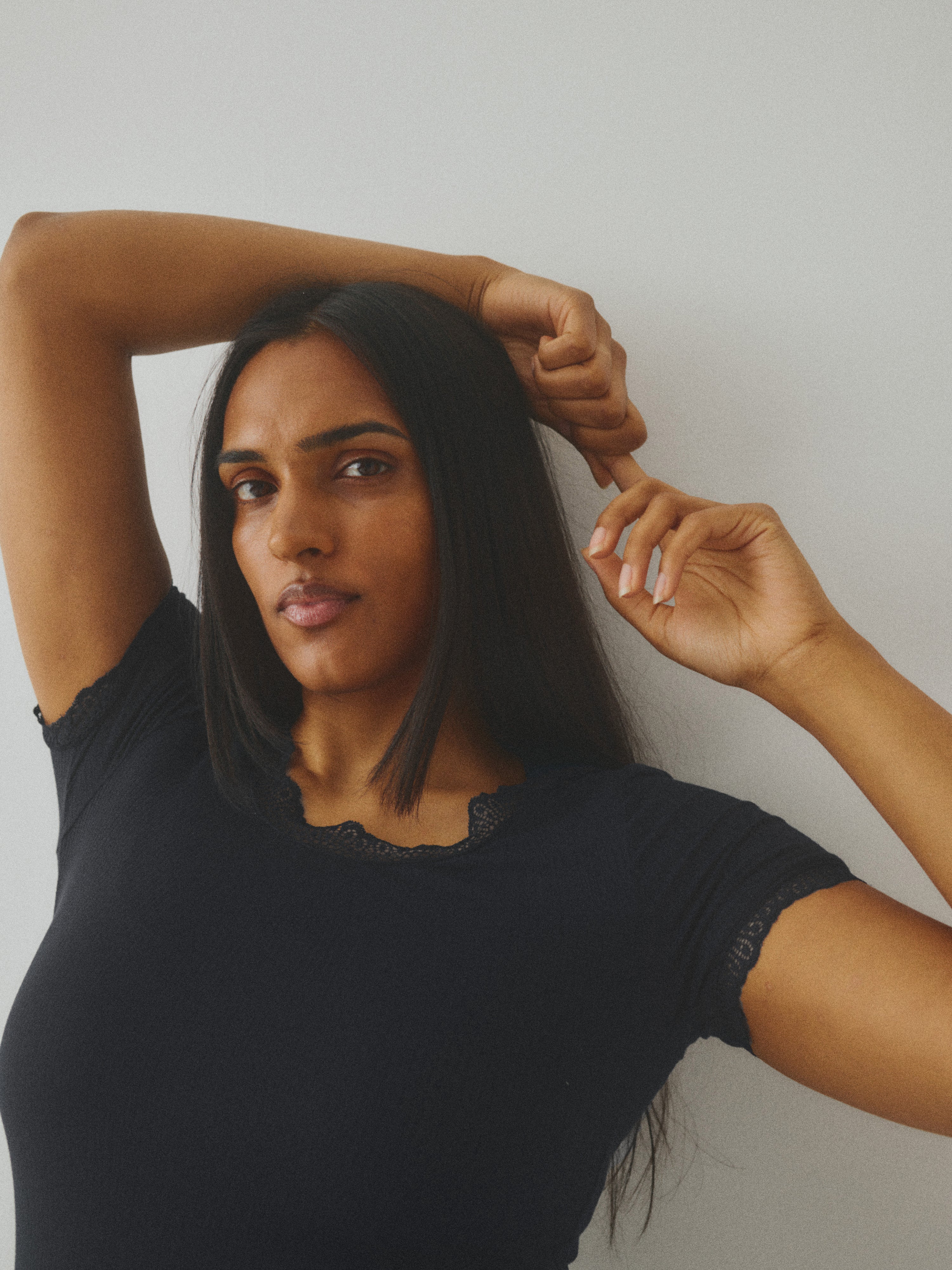 - Strijken op lage temperatuur. Binnenstebuiten keren voor het strijken – geen kant strijken.