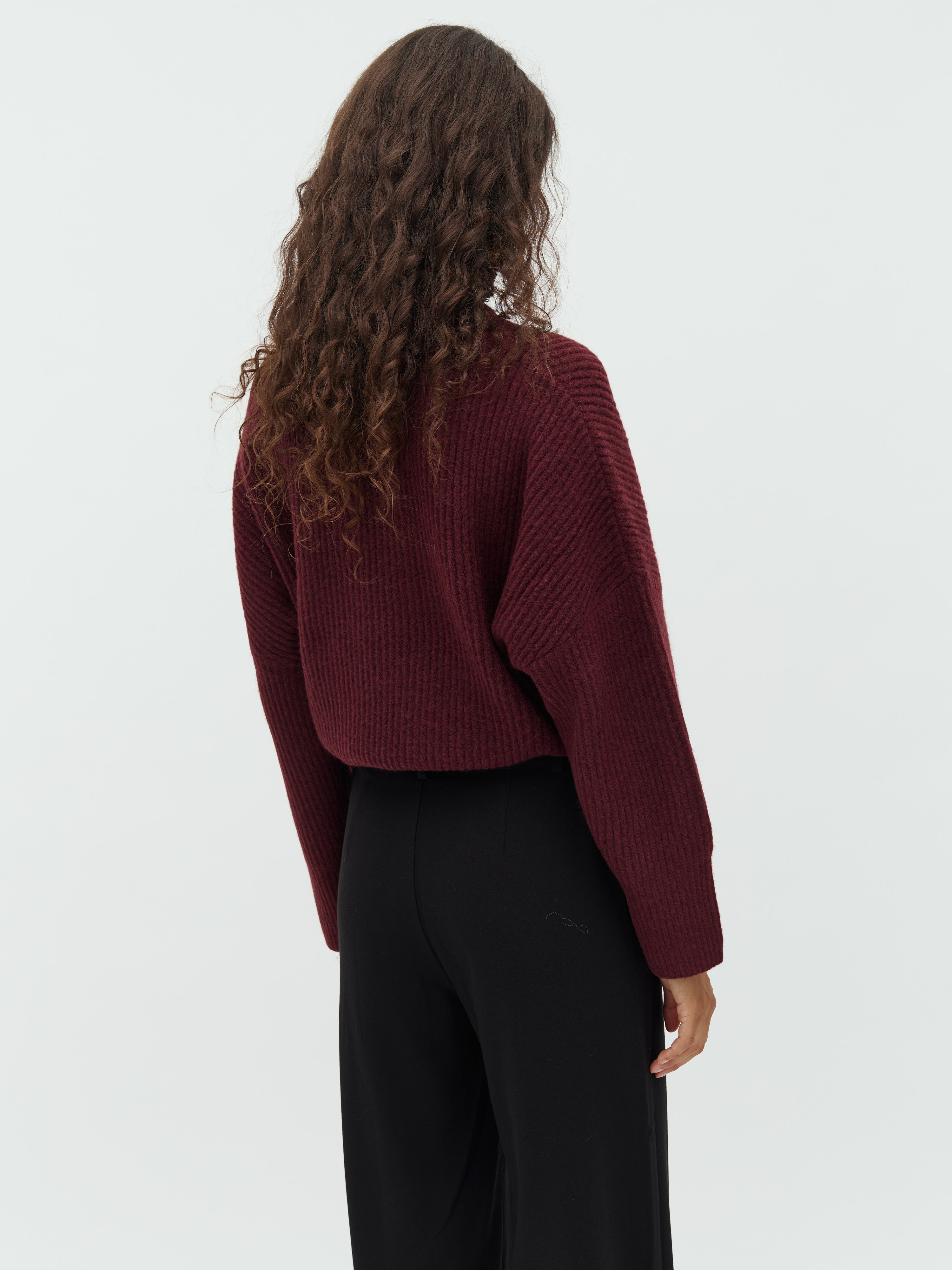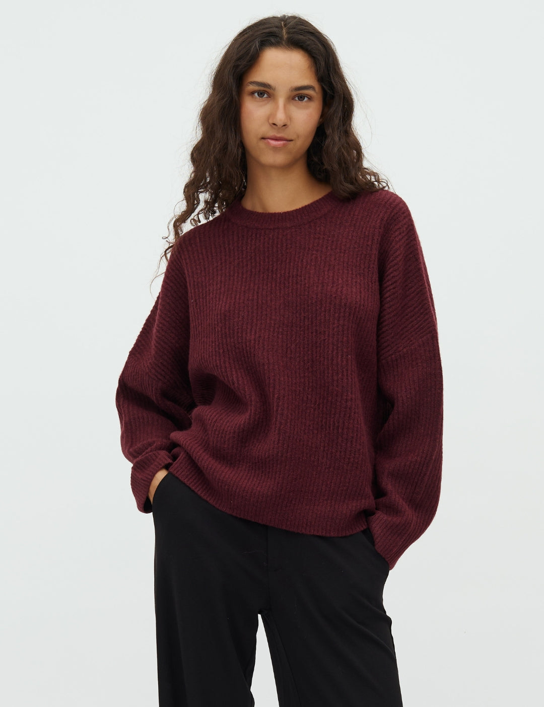 Gebreide trui met ronde hals en verlaagde schouders.