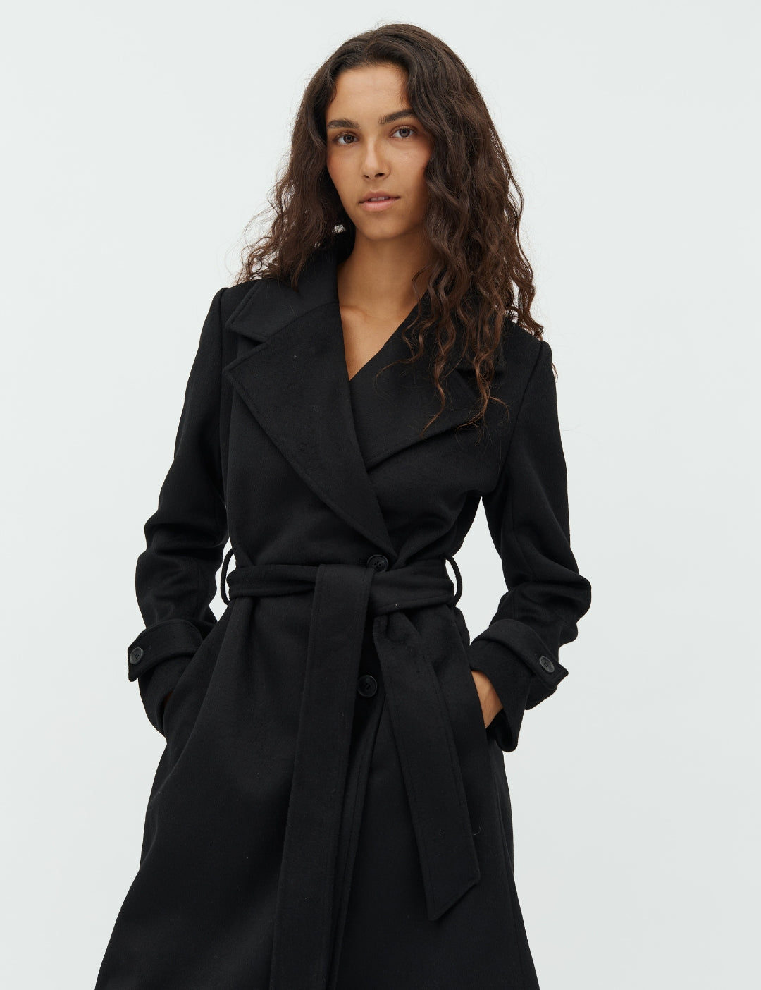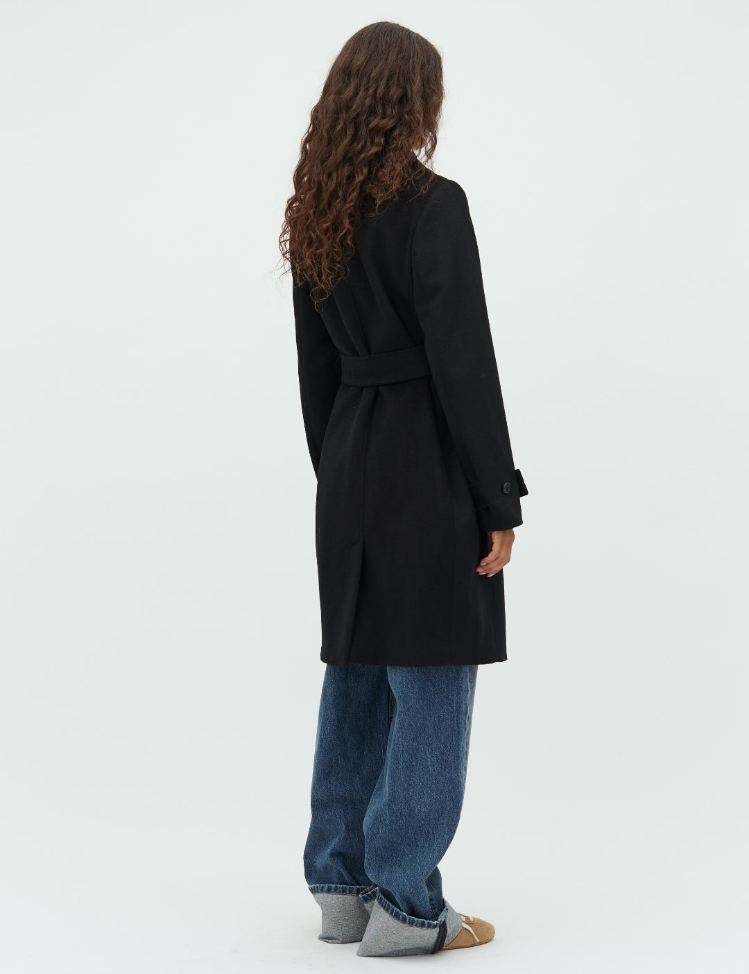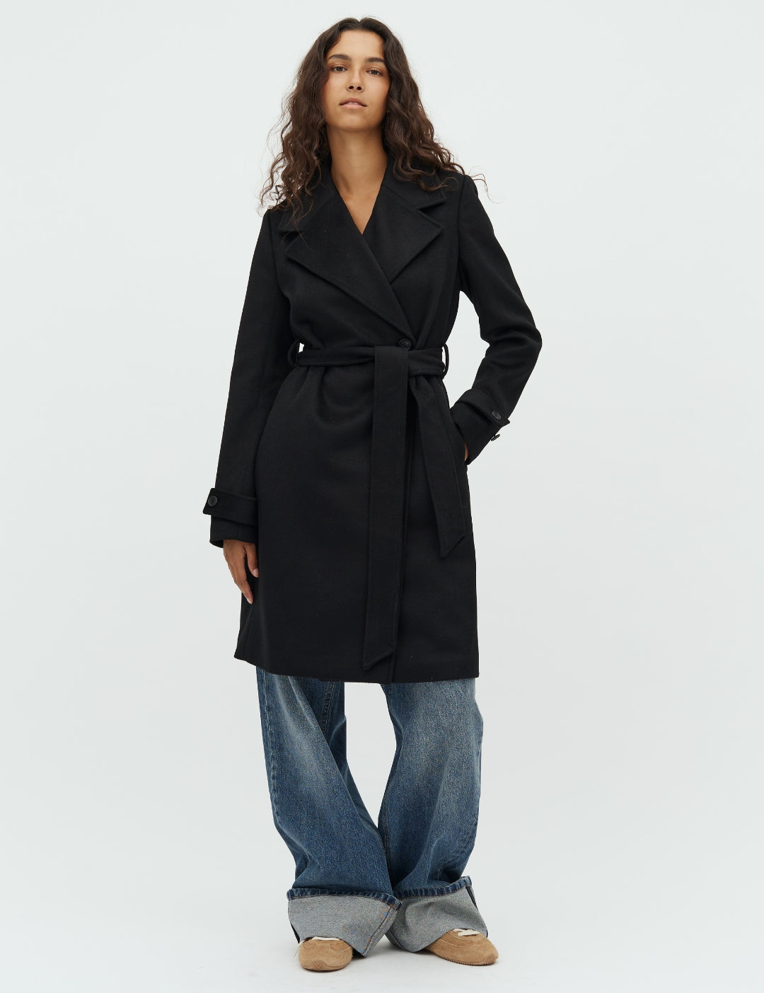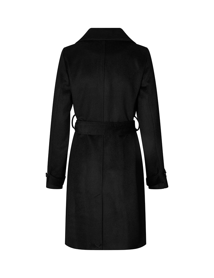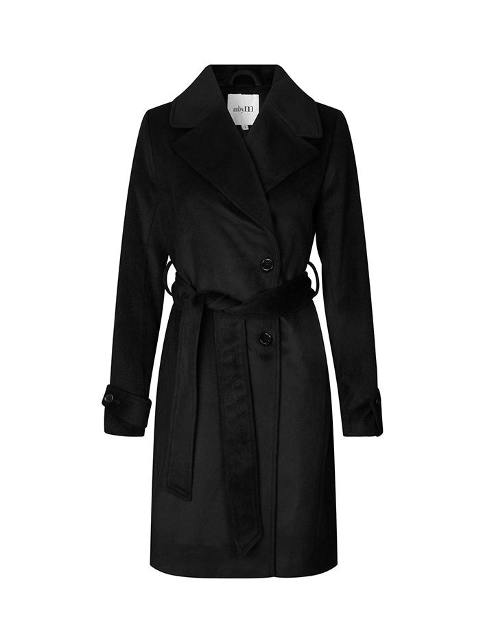 Wollen jas met strikbandjes.