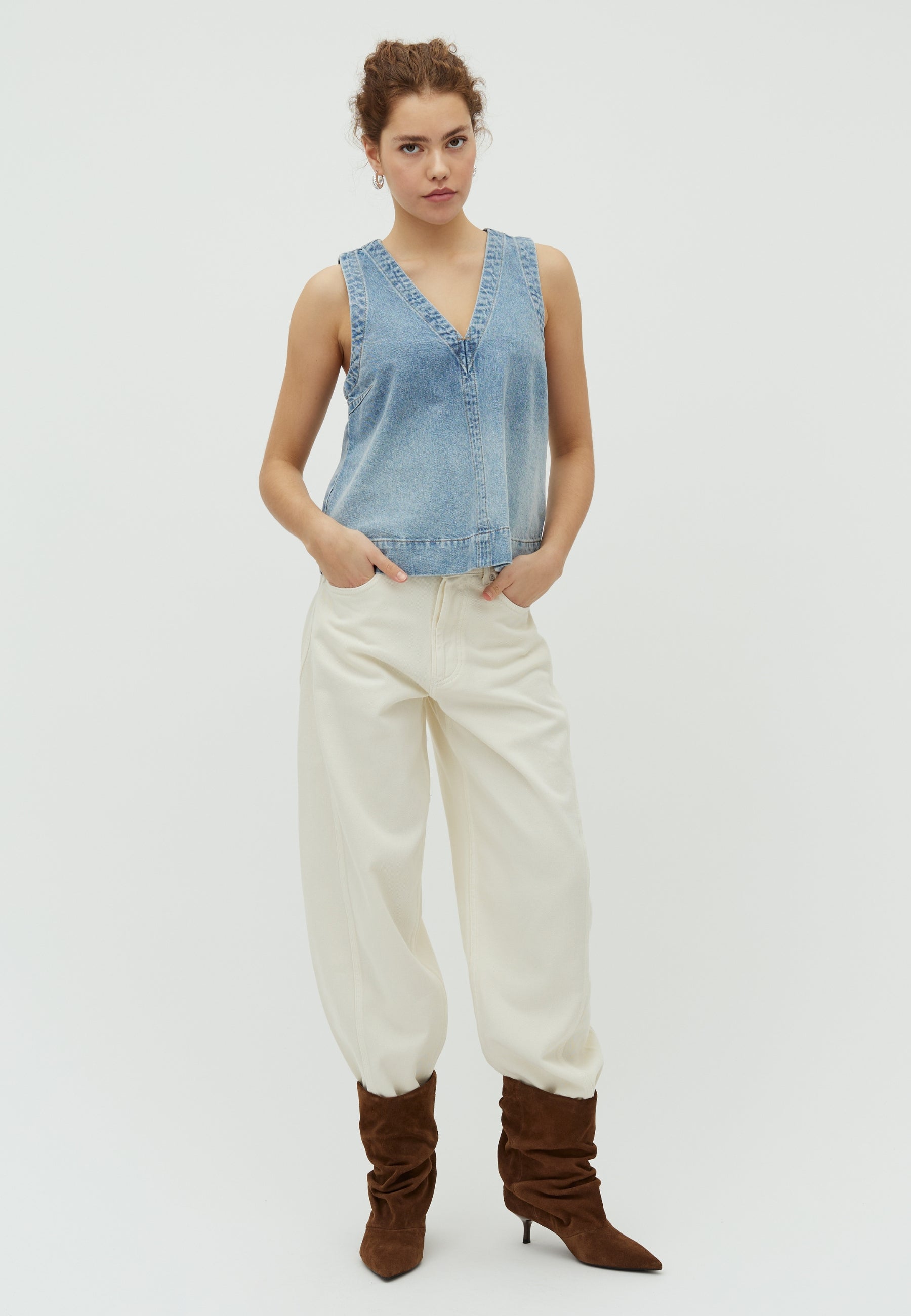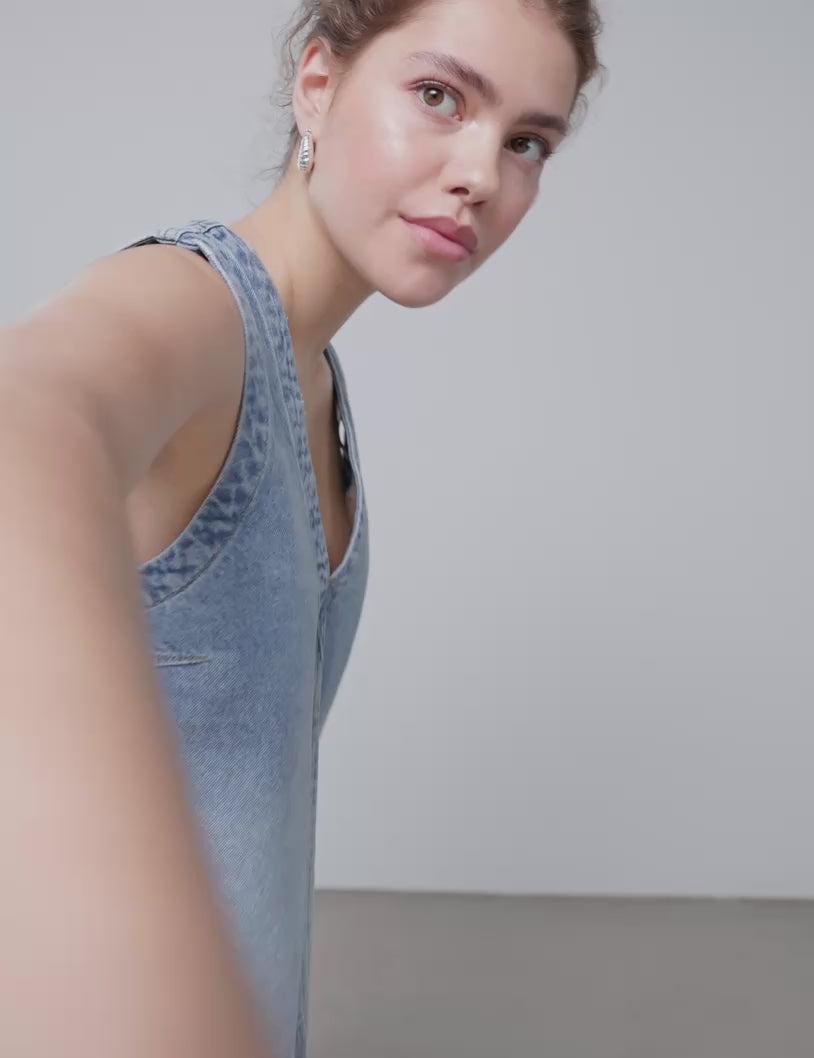 Het model is 174 cm lang en draagt een maat S.