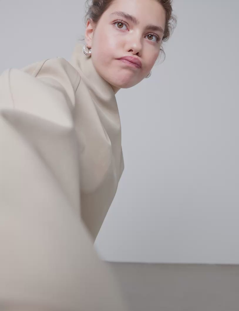 Het model is 174 cm lang en draagt een maat S.