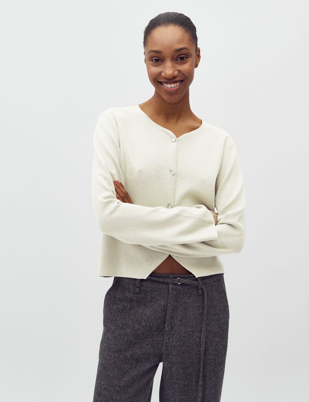 Gebreid cardigan met zilverkleurige knopen.
