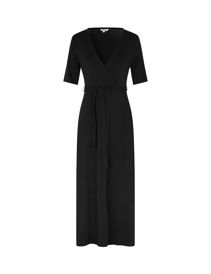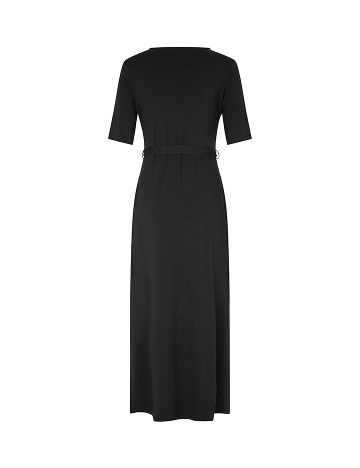 Lange jurk met korte mouwen, fake overslag en ceintuur.