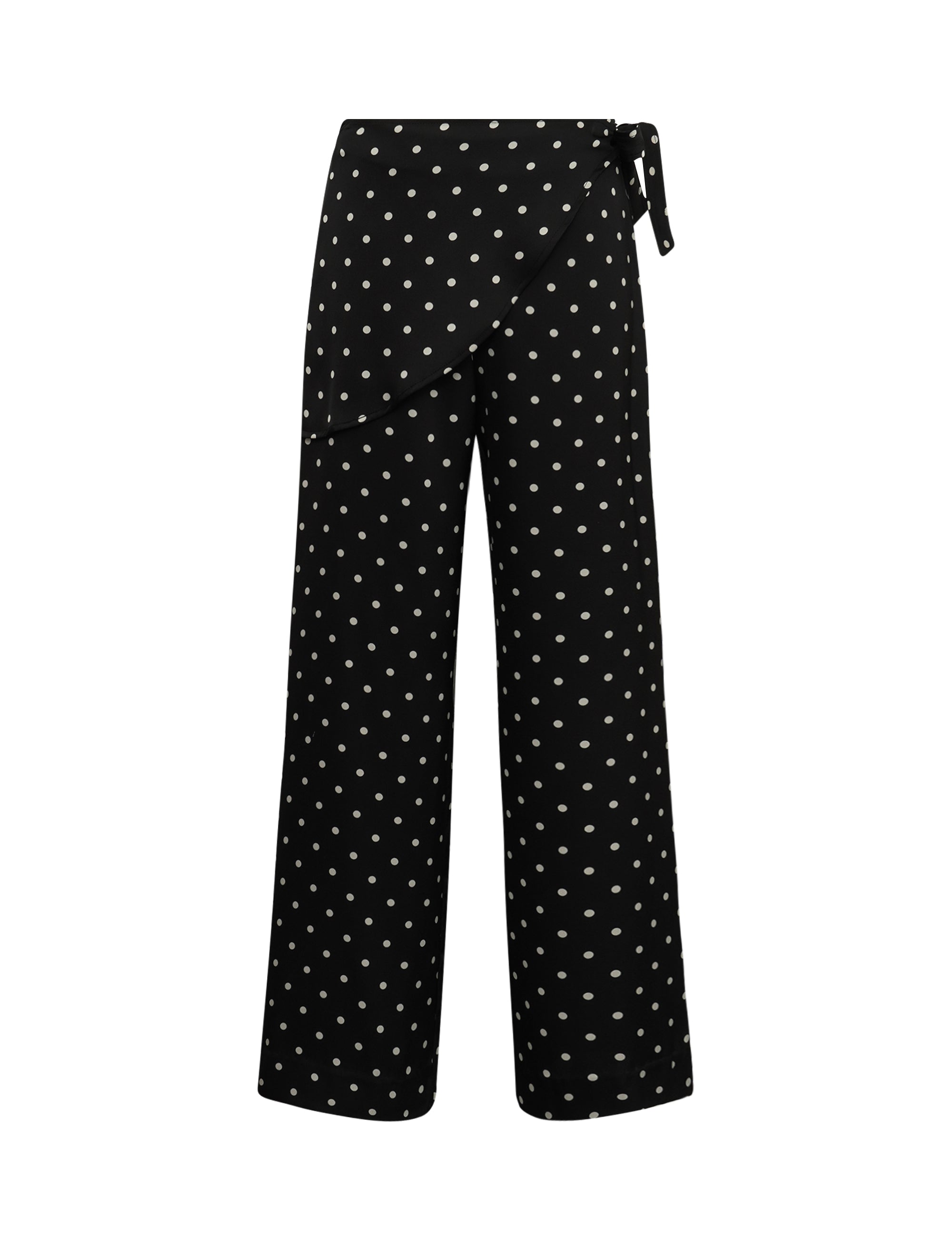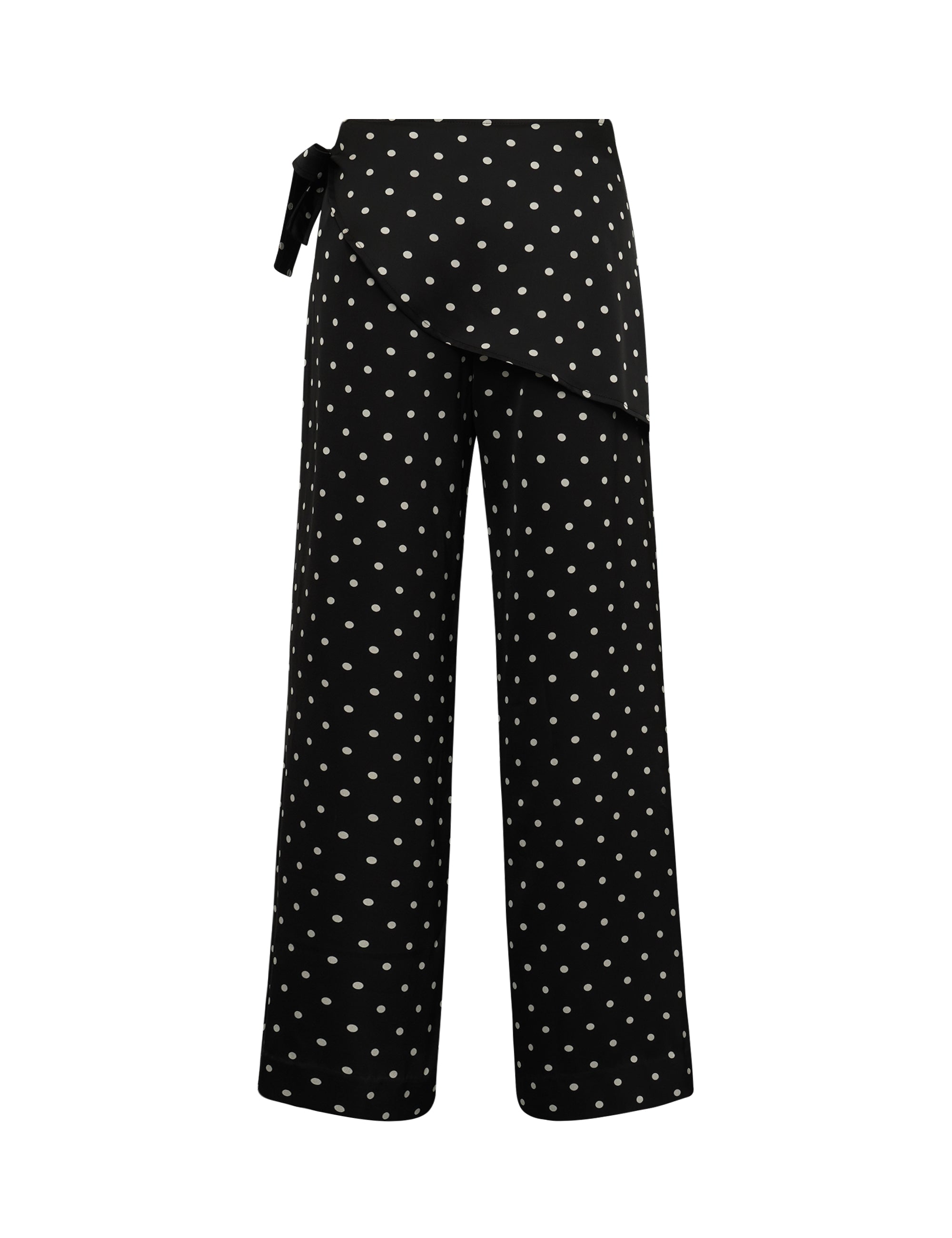 Gestippelde satijnen broek met vastgenaaide sjaal