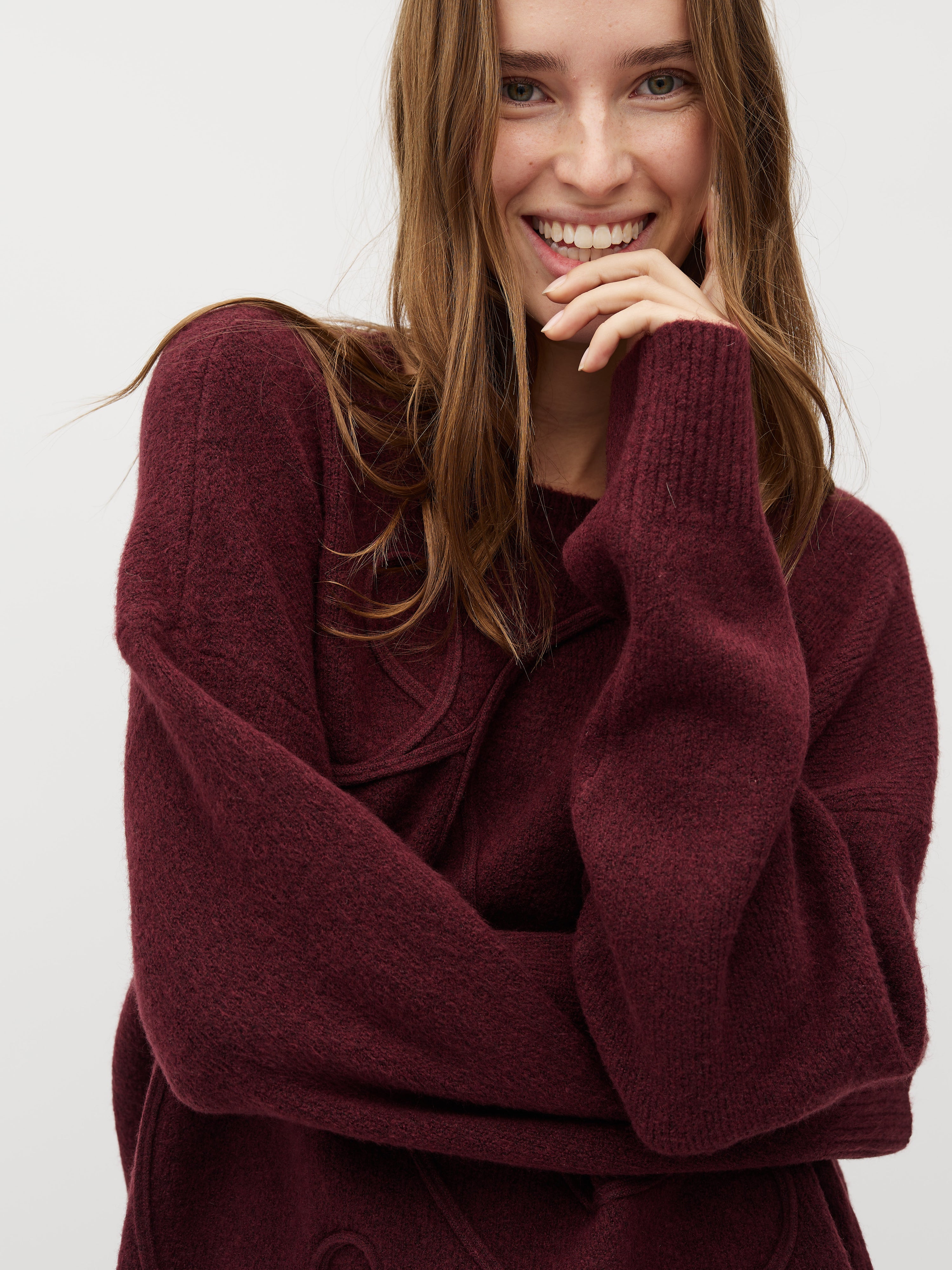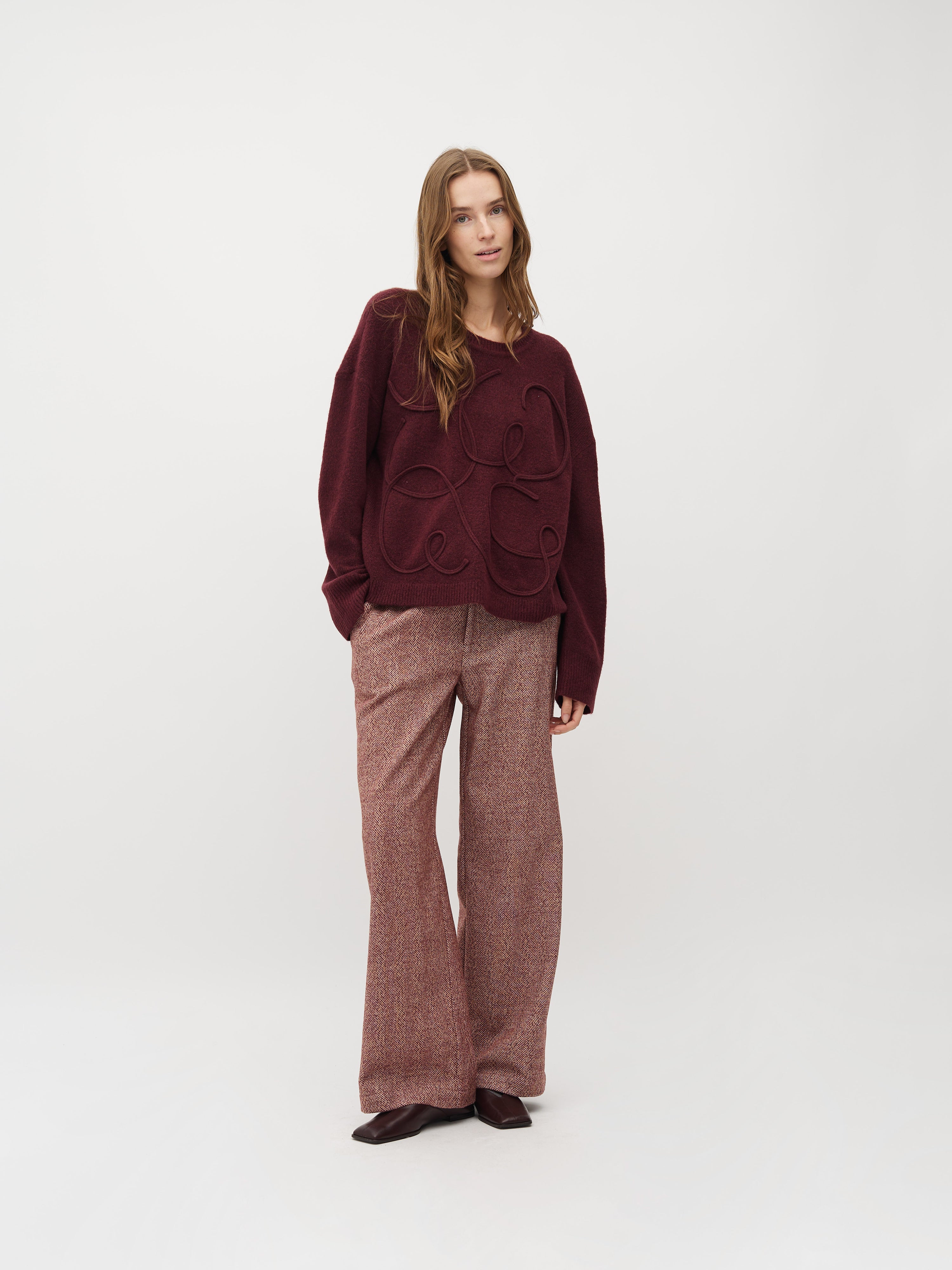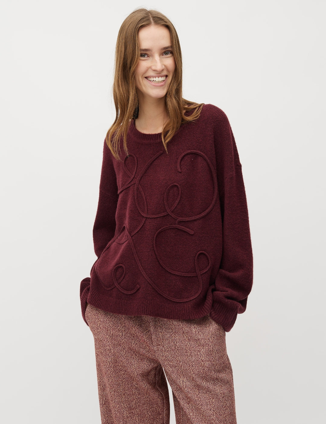 Dunne gebreide trui met geborduurd patroon.