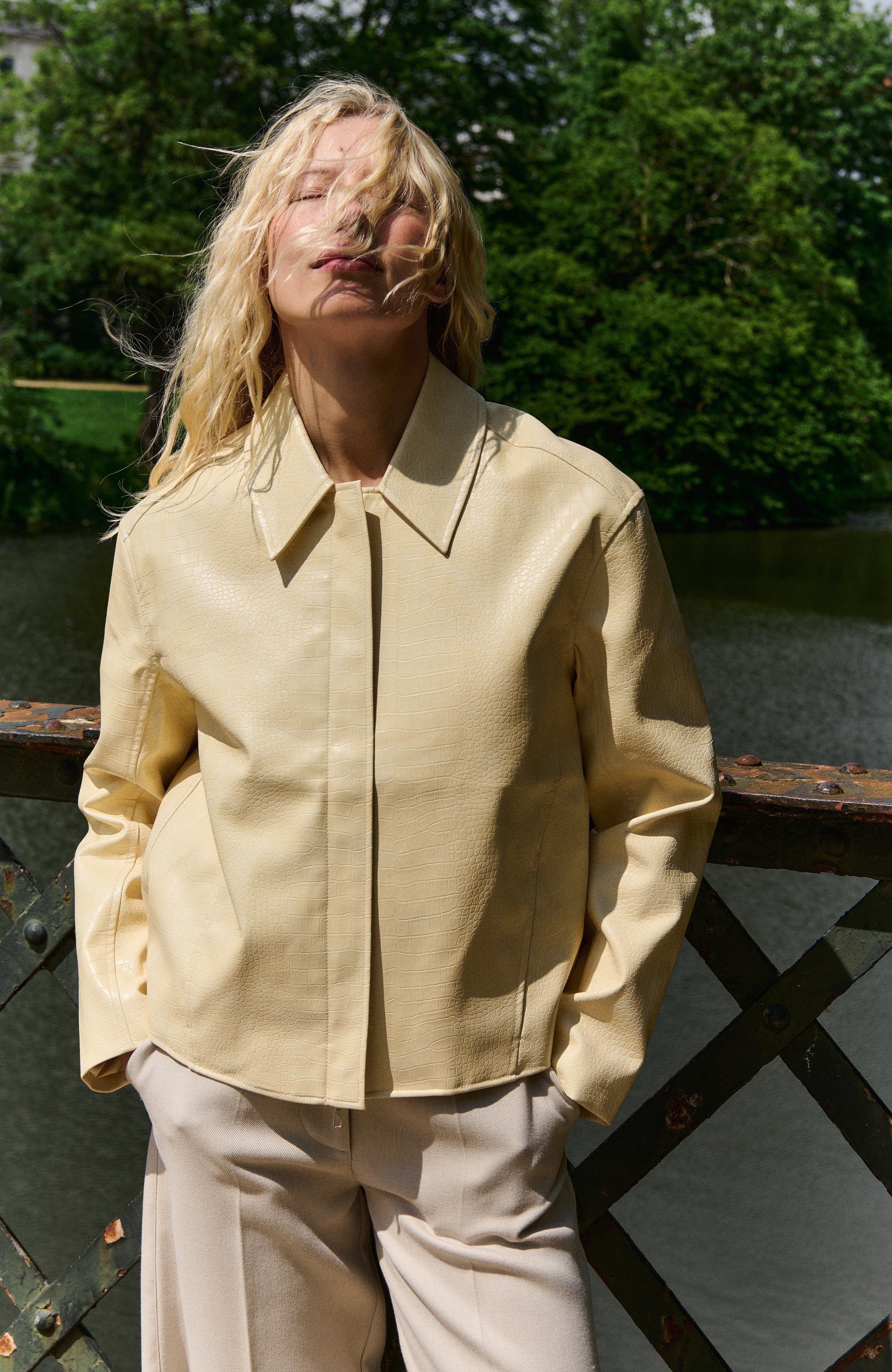 Korte imitatie lederen jas met verborgen sluiting.
